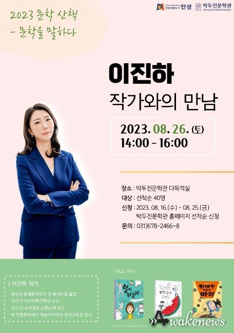 어웨이크뉴스 오경하 기자 | 안성시 박두진문학관은 오는 8월 26일(토) 문학관 다목적실에서 이진하 아동문학가 초청 문학 특강 「2023 문학산책: 문학을 말하다」를 운영한다고 밝혔다.