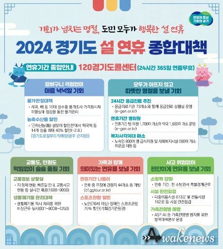 어웨이크뉴스 오경하 기자 | 경기도가 ‘기회가 넘치는 명절, 도민 모두가 행복한 설 연휴’를 위해 총 5개 분야 24개 대책을 중점으로 ‘설 연휴 종합대책’을 추진한다. 연휴 기간 불편 사항이 있을 경우, 경기도 콜센터(031-120)로 전화하면 도움을 받을 수 있다.