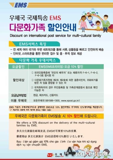 어웨이크뉴스 오경하 기자 | 경기도와 경인지방우정청은 도내 거주 다문화가족을 대상으로 모국에 발송하는 개인 국제특송(EMS)의 요금을 10% 할인하고 있다고 22일 밝혔다.