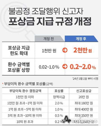 조달청은 불공정 조달행위 관련 신고 활성화를 위해 「불공정 조달행위 신고자에 대한 포상금 지급에 관한 규정」을 3월 1일부터 개정 시행하여 신고 보상 규모를 국민이 체감할 수 있는 수준으로 대폭 확대한다.