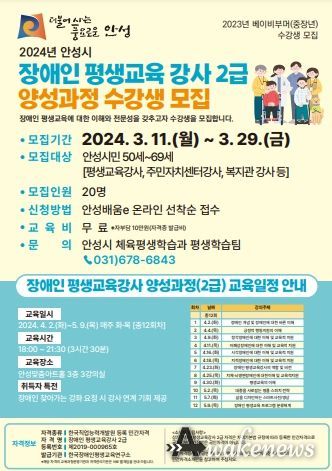 교육신청은 3월 11일 9시 선착순 접수로 진행되며, 참가 신청 및 문의는 안성시 교육통합 플랫폼 ‘안성 배움e’ 홈페이지를 통해 인터넷 접수로 진행된다.
