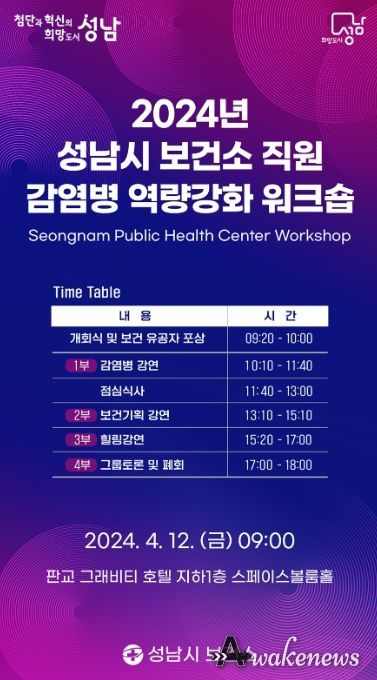 어웨이크뉴스 오경하 기자 | 성남시는 오는 4월 12일 오전 9시~오후 6시 지역 내 호텔에서 수정·중원·분당구 보건소 직원들의 감염병 예방 역량을 강화하기 위한 워크숍을 개최한다.