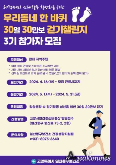 어웨이크뉴스 오경하 기자 | 고양특례시 일산동구보건소에서는 지역주민의 체력증진과 신체활동 활성화를 위한 ‘우리동네 한 바퀴 30일 30만보 걷기챌린지’ 3기 참가자를 4월 16일(화)부터 모집한다고 밝혔다.