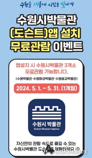 어웨이크뉴스 오경하 기자 | 수원시박물관이 가정의 달을 맞아 수원시박물관 앱을 설치한 시민에게 5월 1일부터 31일까지 수원·수원화성·수원광교 박물관을 무료로 개방한다.
