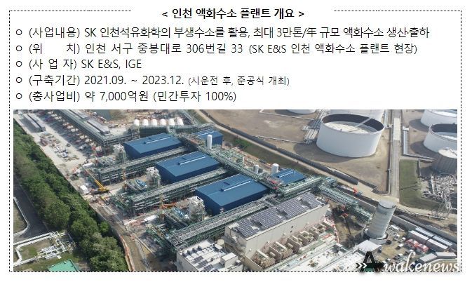 「인천 액화수소 플랜트」는 SK E&S가 총 7천억 원을 투자해 구축한 것으로, 최대 연 3만 톤의 액화수소를 생산할 계획이다. 이는 연간 약 5,000대의 수소버스가 충전할 수 있는 규모로, SK E&S는 동 플랜트와 연계해 금년중 약 20개소를 시작으로 '26년까지 총 40개소의 액화충전소를 전국에 구축하여 액화수소 유통망을 조성해 나갈 계획이다.