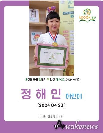 어웨이크뉴스 오경하 기자 | 이천시 효양도서관에서 운영하는 '세상을 바꿀 천 권의 책 읽기' 사업의 70번째 천 권의 책 읽기 달성 주인공이 탄생했다.