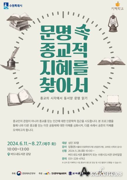 어웨이크뉴스 오경하 기자 | 수원시 버드내도서관이 ‘2024 지혜학교 '문명 속 종교적 지혜를 찾아서'’ 강좌 수강생을 28일부터 모집한다.