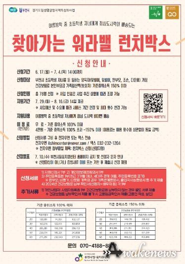 어웨이크뉴스 오경하 기자 | 부천여성청소년재단이 운영하는 부천시일쉼지원센터는 관내 일하는 양육자 가정의 초등학생 자녀에게 여름방학 기간 중 찾아가는 워라밸 런치박스 사업을 추진한다.