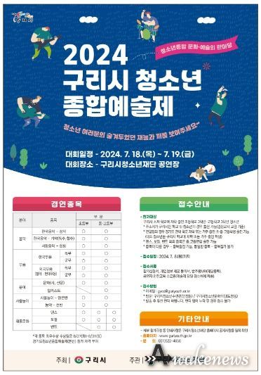 어웨이크뉴스 오경하 기자 | 구리시청소년재단은 구리시 청소년을 대상으로 문화ㆍ예술 분야에서 재능을 펼칠 수 있는 ‘2024년 구리시 청소년 종합예술제’ 참가자를 오는 7월 8일까지 모집한다.