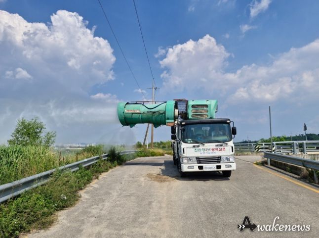 26일 시작한 방제는 트럭에 탑재한 광역방제기로 친환경 약제와 농업기술센터에서 생산한 미생물을 혼합 살포하는 방식으로 이뤄진다. 방제 차량이 진입하지 못하는 지역은 농업인이 자체적으로 방제한다.