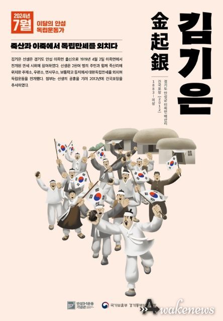 어웨이크뉴스 오경하 기자 | 안성시와 국가보훈부 경기동부보훈지청은 공동으로 안성3.1독립만세운동에 참여한 독립운동가 김기은(金起銀)선생을 '2024년 7월 이달의 안성 독립운동가'로 선정했다.