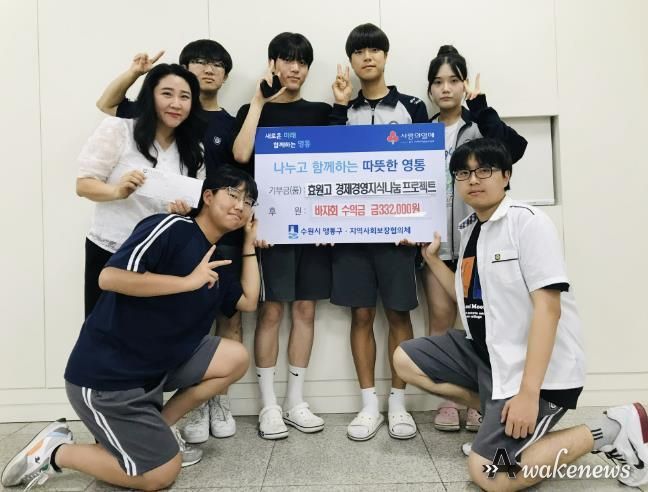 어웨이크뉴스 오경하 기자 | 수원시 영통구에 소재한 효원고등학교의 경제경영지식나눔 프로젝트팀 학생 6명은 지난 10일 영통구를 방문하여 바자회 수익금 전액을 재활용품 수집 어르신을 위해 사용해 달라며 기부했다.