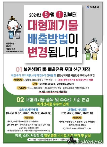 불연성폐기물 포대는 하남시청 홈페이지에서 ‘종량제물품 지정판매소’를 검색해 확인한 지정판매소를 방문해 10리터(1,000원)와 20리터(2,000원) 두 종류의 포대를 구매할 수 있다. 다만 포대를 판매하는 지정판매소를 방문하기 어려운 경우를 고려해 대형폐기물 스티커를 부착해 배출하는 기존 방식도 병행한다.