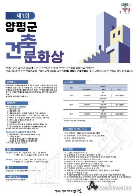 어웨이크뉴스 오경하 기자 | 양평군(군수 전진선)이 2024년 제1회 양평군 건축문화상 시상 계획을 밝혔다.
