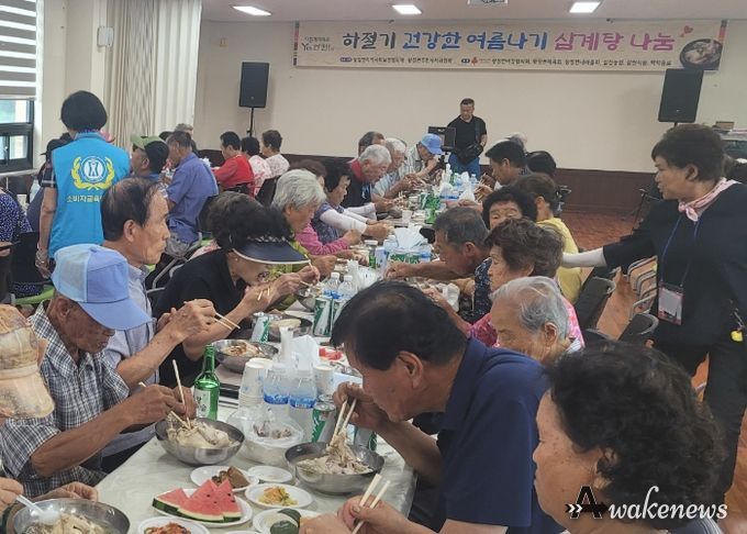 어웨이크뉴스 오경하 기자 | 연천군 왕징면 지역사회보장협의체와 주민자치위원회는 8일 왕징면주민복지문화센터에서 협의체위원 및 주민자치위원 30여명이 참여한 가운데, 관내 취약계층 및 어르신 250명에게 직접 조리한 삼계탕을 제공하는 건강한 여름나기 나눔행사를 실시했다.