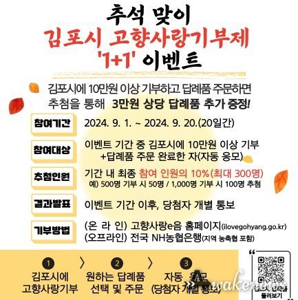 어웨이크뉴스 오경하 기자 | 김포시는 민족 대명절 추석을 맞이하여 고향사랑기부제 홍보와 기부 모금액 확대를 위해 9월 1일부터 20일까지 '추석 맞이 김포시 고향사랑기부제 ‘1+1’ 이벤트'를 진행한다고 밝혔다.