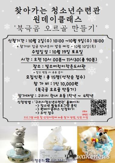 어웨이크뉴스 오경하 기자 | 구리시청소년재단은 10월 19일 빛소어린이작은도서관에서 ‘찾아가는 청소년수련관-북극곰 오르골 만들기’ 프로그램을 운영한다.