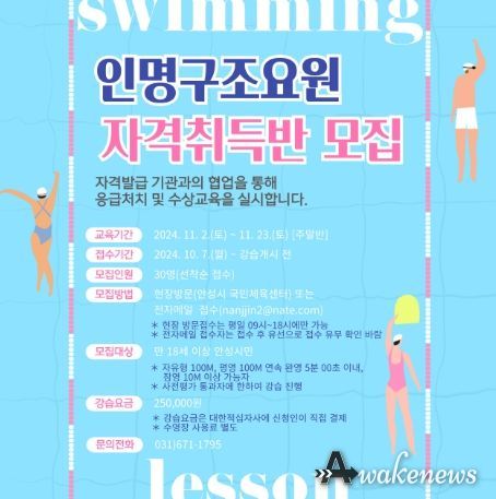 어웨이크뉴스 오경하 기자 | 안성시시설관리공단에서 운영 중인 안성시국민체육센터는 시민들을 대상으로 수상안전요원 자격취득 교육과정을 운영한다고 밝혔다.