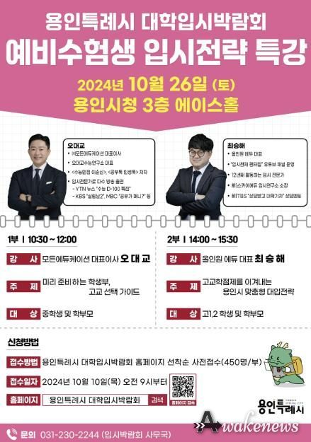 어웨이크뉴스 오경하 기자 | 용인특례시는 오는 26일 시청 에이스홀에서 열리는 ‘예비 수험생을 위한 입시전략 특강’ 참가자를 모집한다고 8일 밝혔다.