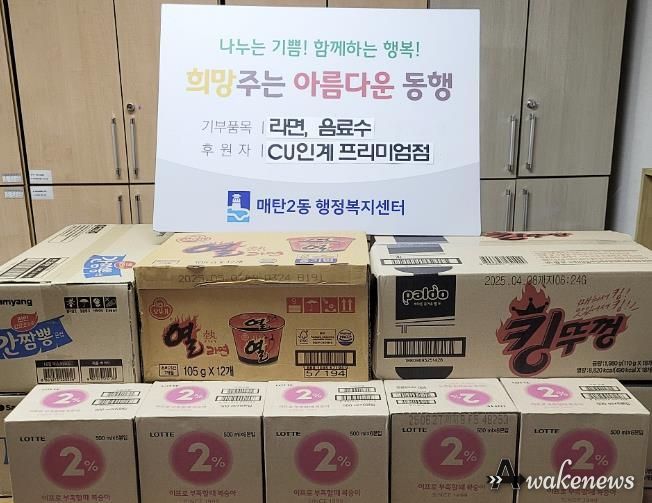 어웨이크뉴스 오경하 기자 | 지난 16일 CU 인계프리미엄점에서 취약 가구를 위해 컵라면 6박스와 음료수 5박스를 매탄2동 행정복지센터에 기부했다.