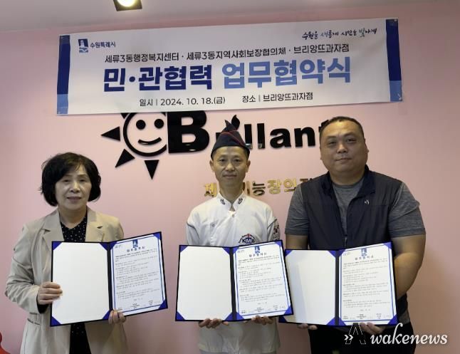 어웨이크뉴스 오경하 기자 | 수원시 권선구 세류3동은 지난 18일 지역사회보장협의체 및 브리앙뜨과자점과 함께 관내 복지대상자 지원을 위한 업무협약(MOU)을 체결했다.