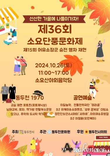 어웨이크뉴스 오경하 기자 | 동두천시는 오는 10월 26일, 오전 11시부터 소요산 (소요야외음악당)에서 11시부터 ‘제36회 소요단풍문화제 및 제15회 어유소장군 행차 재현’을 개최한다고 밝혔다.