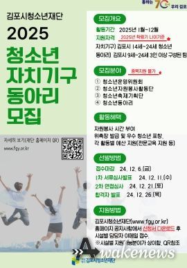 어웨이크뉴스 오경하 기자 | 김포시청소년재단에서 2025년 청소년 수련시설을 함께 이끌어 갈 청소년자치기구 및 동아리 참여자를 오는 10월 29일부터 12월 6일까지 모집한다.