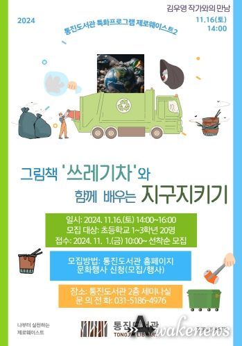 어웨이크뉴스 오경하 기자 | 김포시 통진도서관이 오는 11월 16일 14:00부터 16:00까지 2024년 통진도서관 특화프로그램 '그림책 ‘쓰레기차’와 함께 배우는 지구지키기'를 운영한다.