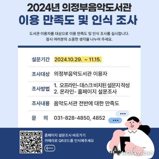 어웨이크뉴스 오경하 기자 | 의정부음악도서관은 10월 29일부터 11월 15일까지 도서관 운영 전반에 대해 점검하고, 이용자 중심의 서비스를 제공하고자 지역 주민을 대상으로 ‘이용 만족도 및 인식 조사’를 실시한다.