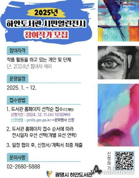 어웨이크뉴스 오경하 기자 | 광명시 하안도서관이 11일부터 17일까지 ‘2025년 시민열린전시코너’ 참여 작가를 모집한다.