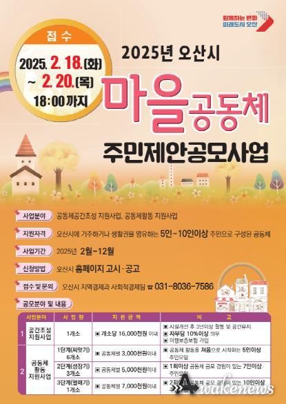 어웨이크뉴스 오경하 기자 | 오산시는 『2025년 오산시 마을공동체 주민제안 공모사업』 신청자를 이달 18일부터 20일까지 모집한다.