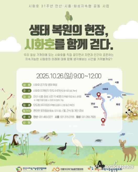 어웨이크뉴스 오경하 기자 | 시흥ㆍ안산ㆍ화성 지속가능발전협의회는 시화호를 함께 품고 있는 세 개 도시의 공동 사업으로, 시화호 담수화 중단 31주년을 맞아 오는 10월 26일 오전 9시부터 ‘생태복원의 현장, 시화호를 함께 걷다’ 행사를 탄도수로(탄도항~외지섬)에서 개최한다.