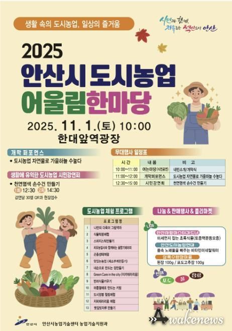 어웨이크뉴스 오경하 기자 | 안산시는 11월 1일 한대앞역 광장 일원에서 ‘안산시 도시농업 어울림한마당’을 개최한다고 21일 밝혔다.