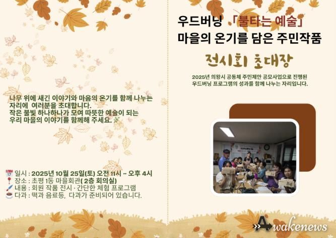 어웨이크뉴스 오경하 기자 | 의왕시는 마을공동체 자강불식이 오는 10월 25일 초평1동마을회관(윗새우대북길 14)에서'우드버닝, 불타는 예술'작품전시회를 개최한다고 밝혔다.