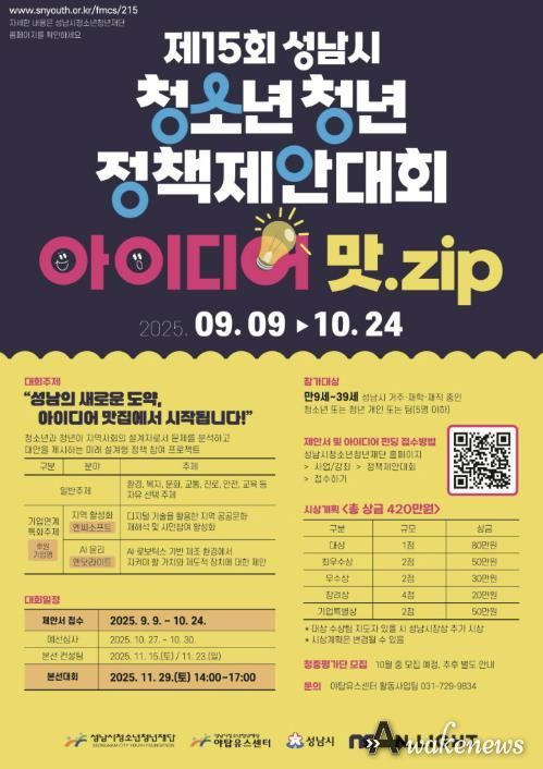 어웨이크뉴스 오경하 기자 | 성남시청소년청년재단 야탑유스센터는 청소년과 청년이 지역사회 문제를 발굴하고 해결방안을 제시하는 제15회 성남시청소년청년정책제안대회 ‘아이디어 맛.zip’접수를 진행 중이라고 밝혔다. 대회 접수는 10월 24일까지 온라인으로 이뤄진다.