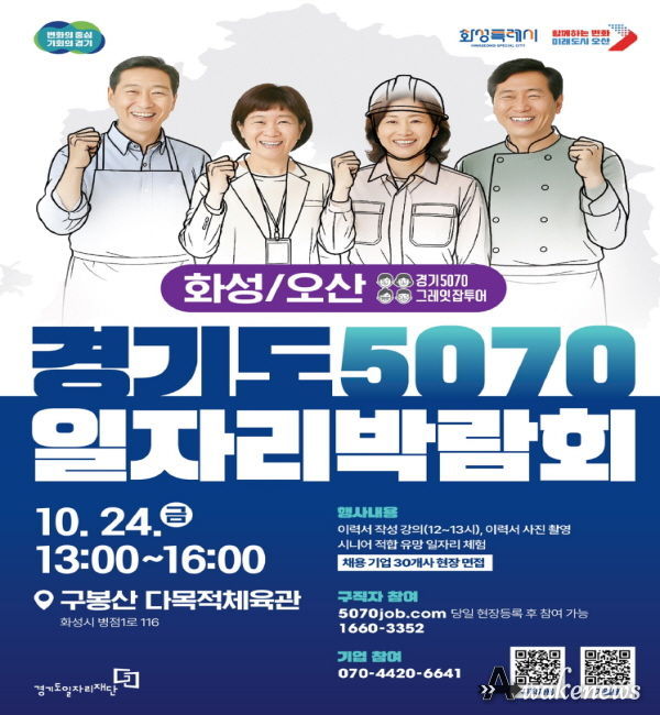 어웨이크뉴스 오경하 기자 | 경기도와 경기도일자리재단은 오는 10월 24일, 구봉산 다목적체육관에서 중장년층을 위한 『2025 경기도 5070 일자리박람회 in 화성+오산』를 개최한다고 밝혔다.