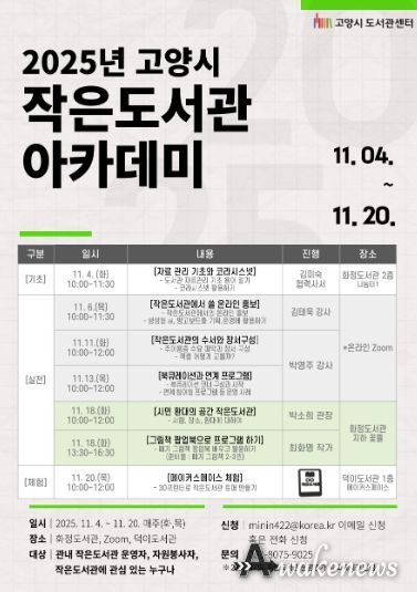 어웨이크뉴스 오경하 기자 | 고양특례시는 관내 공·사립 작은도서관 운영자와 자원봉사자의 역량 강화를 위해 오는 11월 4일부터 20일까지 총 7회에 걸쳐‘2025년 작은도서관 아카데미’를 운영한다고 밝혔다.