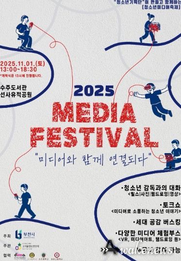 어웨이크뉴스 오경하 기자 | 부천시와 고리울청소년센터가 주관하는 ‘2025 미디어 페스티벌’이 오는 11월 1일 오후 1시부터 6시까지 수주도서관과 선사유적공원에서 개최된다. 이번 축제는 청소년기획단이 주체가되어 직접 기획하고 준비하여 진행하며, ‘미디어와 함께 연결되다’를 주제로, 사람-사람, 사람-기술이 미디어를 통해 함께 소통하고 공감하는 장을 마련했다.