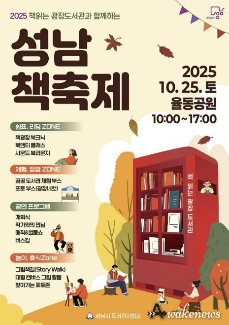 어웨이크뉴스 오경하 기자 | 성남시는 오는 10월 25일 오전 10시~오후 5시 분당 율동공원 내 잔디광장에서 ‘2025 성남 책 축제’를 연다.