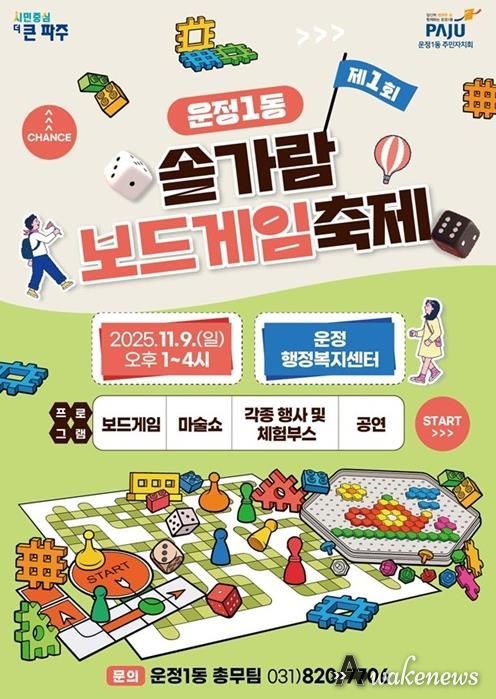 어웨이크뉴스 오경하 기자 | 파주시 운정1동은 오는 11월 9일 13시부터 16시까지 운정행복센터에서 ‘제1회 솔가람 보드게임 축제’를 개최한다고 밝혔다.