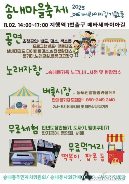 어웨이크뉴스 오경하 기자 | 동두천시 송내동 주민자치위원회는 오는 11월 2일 오후 2시부터 지행역 1번 출구 메타세콰이아길에서 ‘2025 송내마을축제’를 개최한다고 밝혔다.