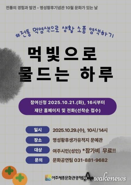 어웨이크뉴스 오경하 기자 | 여주세종문화관광재단은 오는 10월 29일, 명성황후기념관 10월 문화가 있는 날 프로그램으로‘먹빛으로 물드는 하루’를 진행한다.