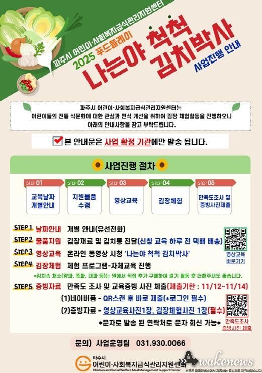 어웨이크뉴스 오경하 기자 | 파주시 위탁기관인 파주시 어린이·사회복지급식관리지원센터는 오는 12일부터 14일까지 관내 어린이 급식소를 대상으로 전통 김장 문화를 배우고 직접 체험하는 활동 ‘나는야 척척 김치 박사’를 운영한다고 밝혔다.