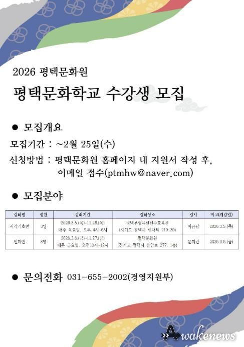 어웨이크뉴스 오경하 기자 | 평택문화원은 지역 전통문화의 계승과 시민 문화향유 기회 확대를 위해 '2026 평택문화학교'를 운영하고, 총 3개 강좌 가운데 민화반과 경기도무형유산 서각장 이규남의 서각기초반 2개 강좌의 수강생을 모집한다. 모집 대상은 평택시민 누구나 가능하며, 접수는 2026년 2월 25일 오후 6시까지 선착순으로 진행된다.