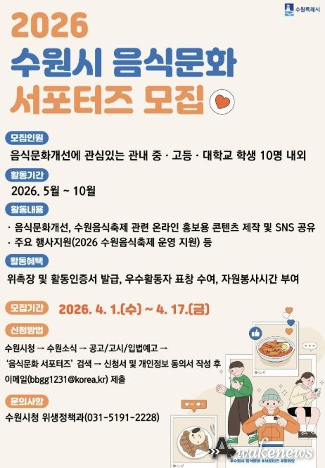 어웨이크뉴스 오경하 기자 | 수원특례시는 ‘2026년 음식문화 서포터즈’로 활동할 중·고등·대학생을 4월 17일까지 모집한다.