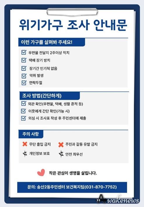 어웨이크뉴스 오경하 기자 | 의정부시 송산2동주민센터는 2026년 상반기를 맞아 취약계층 집중 거주지역을 대상으로 위기가구 발굴‧지원 조사를 본격 추진한다.