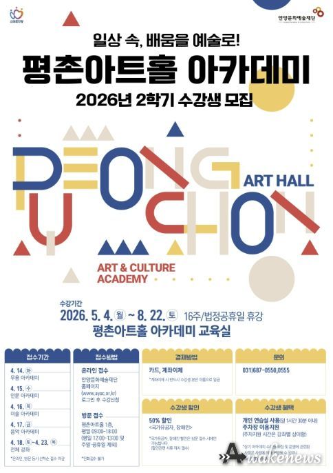어웨이크뉴스 오경하 기자 | 안양문화예술재단은 시민 누구나 문화예술을 자유롭게 접하고 즐겁게 배울 수 있도록 오는 4월 14일부터 23일까지 ‘2026년 평촌아트홀 아카데미’ 2학기 수강생을 모집한다.