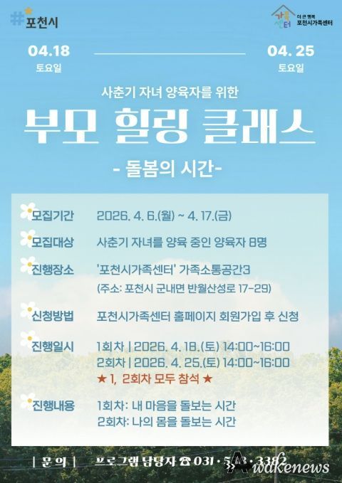 어웨이크뉴스 오경하 기자 | 포천시 더 큰 행복 포천시가족센터는 사춘기 자녀를 둔 양육자를 대상으로 ‘부모 힐링 클래스’ 참여자를 모집한다.
