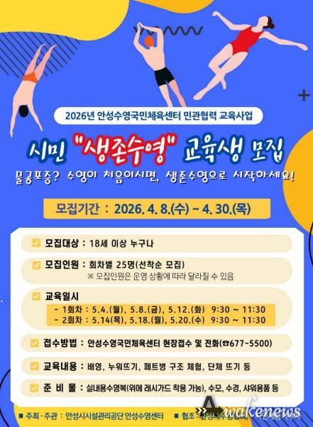 어웨이크뉴스 오경하 기자 | 안성시의 수상 안전망이 전 세대로 확대된다. 안성시시설관리공단이 운영하는 안성수영국민체육센터는 최근 증가하는 수상 사고에 대비해, 초등학생 중심이었던 생존수영 교육을 전 시민 대상으로 확대하는 ‘시민 생존수영교육 혁신사업’을 추진한다. 이번 사업은 공공 체육시설의 유휴 자원을 효율적으로 재배치해 시민들의 실전 생존기술 습득을 돕기 위해 마련됐다.