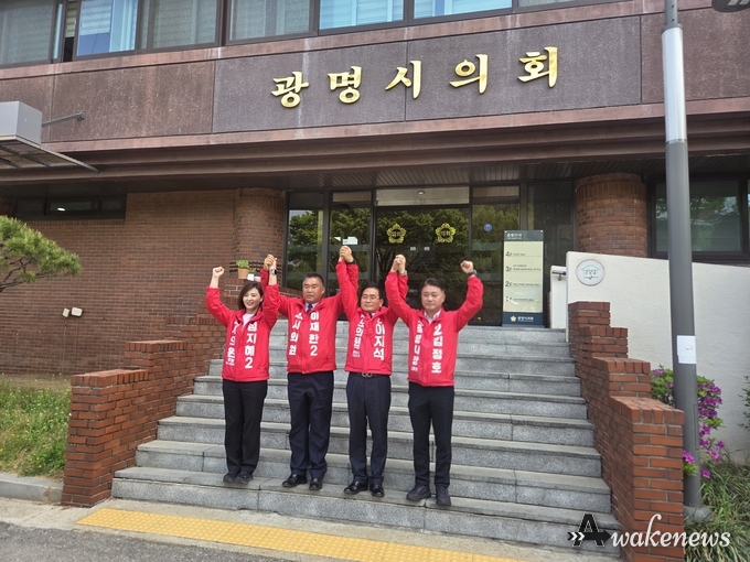 ▲광명시 경기도의원 국민의힘 후보로 출마선언한 이지석 의장과 함께한 광명시의회 국민의힘 후보들(=오경하 기자)